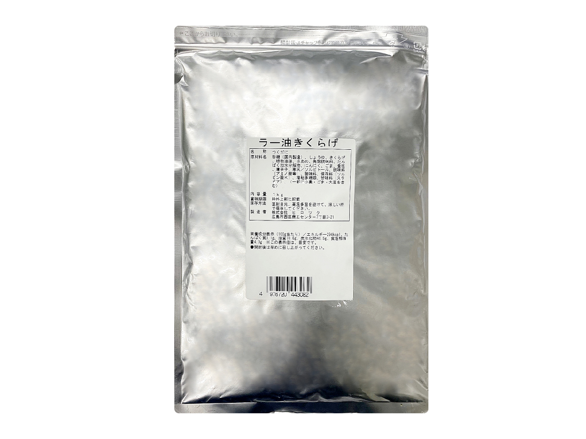 - 業務用佃煮 ラー油きくらげ 1kg 業務用【常温】 販売価格 2,225円(税込み) 会員価格 (税込み) 通常価格 (税込み) 在庫 商品コード 44308 JANコード 数量 - + カートに入れる お気に入りリストへ追加する カテゴリー - 業務用佃煮 ブランド ヒロツク 原材料名: 砂糖(国内製造)、しょうゆ、きくらげ、植物油脂、水あめ、発酵調味料、たん ぱく加水分解物、にんにく、ごま、食塩、唐辛子、寒天/ソルビトール、調味 料(アミノ酸等)、酸味料、保存料(ソルビン酸K)、増粘多糖類、甘味料(ス テビア)、(一部に小麦・ごま・大豆を含む) 内容量:1kg 賞味期限:製造日より120日(※開封後目安:60日) 保存方法:直射日光、高温多湿を避けて、涼しい所で保存してください。 ツイートする シェアする RECOMMENDEDおすすめ商品 丸カップ ラー油昆布 8個セット【冷蔵】 2,318円(税込み) お手軽チューブ 海苔めんたい 200g【常温】 850円(税込み) 瀬戸筏 ラー油きくらげ 170g【冷蔵】 540円(税込み) 瀬戸筏 ラー油昆布 130g【冷蔵】 540円(税込み) 瀬戸筏 ラー油きくらげ 170g 5袋セット【冷蔵】 2,565円(税込み) 丸カップ ラー油昆布 85g【冷蔵】 322円(税込み)