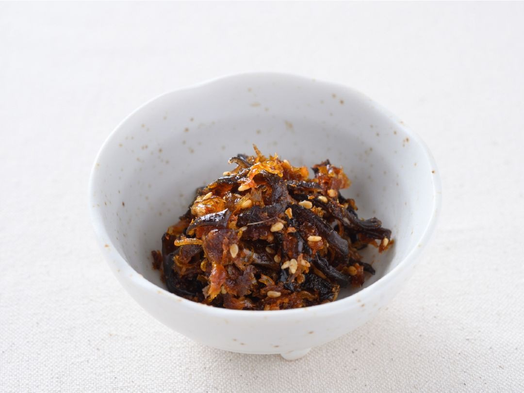 削り節の旨みとちりめんの味わいを、まろやかな甘口で仕上げました。 - きくらげのコリコリ食感